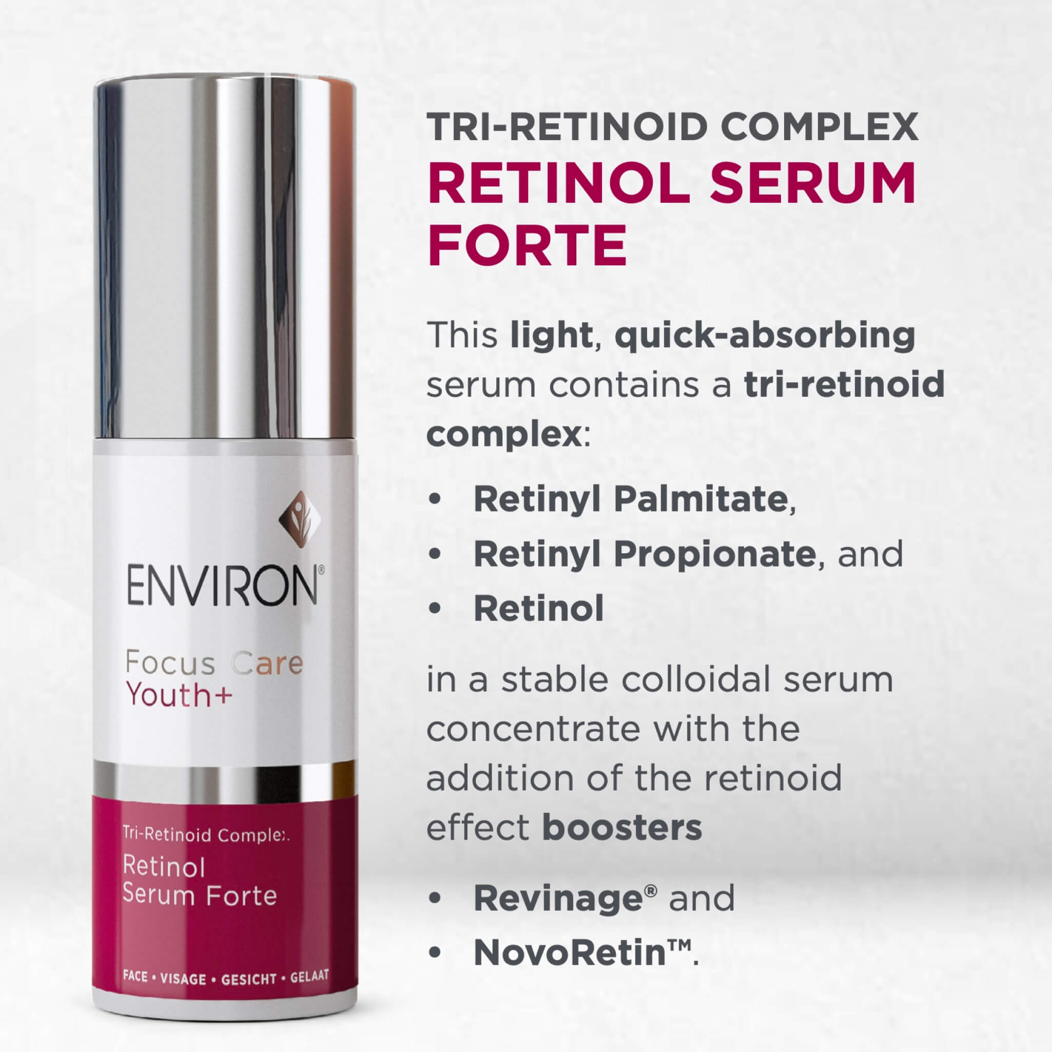 In addition, Retinol Serum Forte contains the Retinol-like ingredients namely Revinage® and NovoRetin™ to enhance the effects of the Tri-Retinoid Complex. By adding these we are boosting the overall vitamin A effect, without adding more vitamin